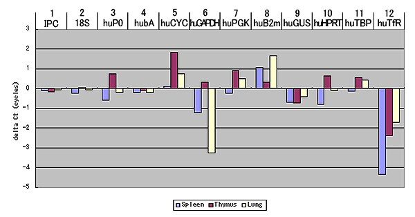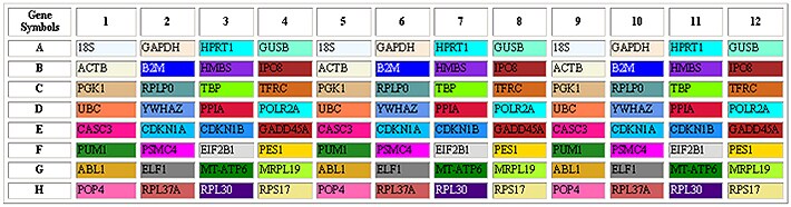 図1 TaqMan® Human Endogenous Control Plateに搭載されている候補遺伝子。18S rRNA (18S)、ribosomal protein large P0 (huP0)、β-actin (hubA) 、peptidylprolyl isomerase A (cyclophilin A) (huCYC)、GAPDH (huGAPDH)、phosphoglycerate kinase 1 (huPGK)、β-2-microglobulin (huB2m)、β-glucuronidase (huGUS)、hypoxanthine phosphoribosyltransferase 1 (huHPRT)、TATA box binding protein (huTBP)、transferrin receptor (p90, CD71) (huTfR)