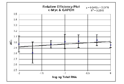 - ターゲット遺伝子(例えばc-myc)と内在性コントロール遺伝子(例えばGAPDH)のCt値をリアルタイムPCRシステムで測定し、⊿Ct値を算出する