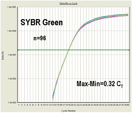 一見1本の増幅曲線に見えますが、実はなんと96本の曲線です。Ctの最大値と最小値の間は0.32サイクルしかありません。いかにウェル間のばらつきが小さいかが、この図から分かりますね!