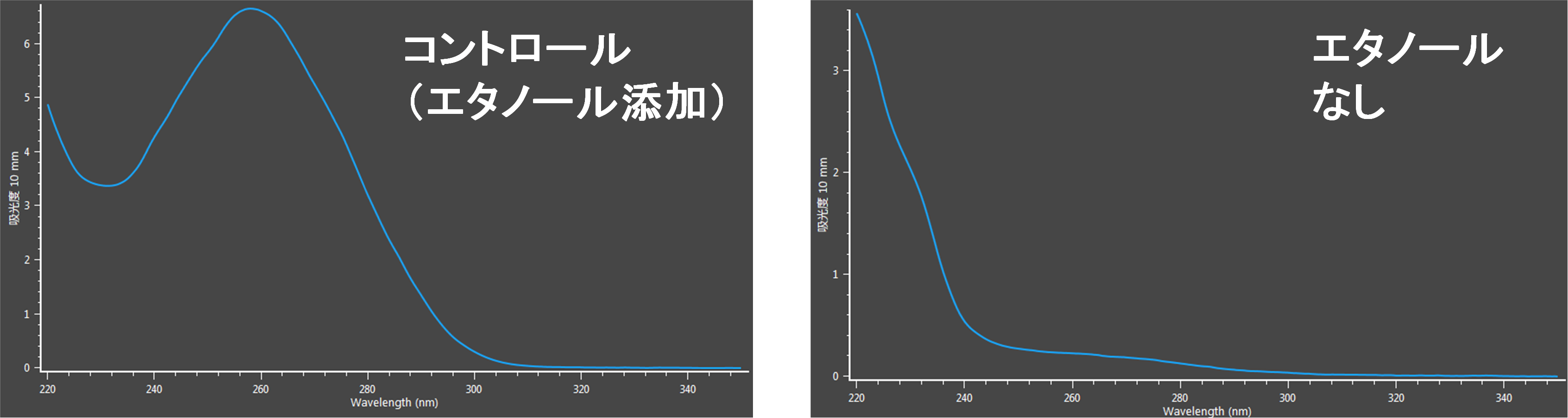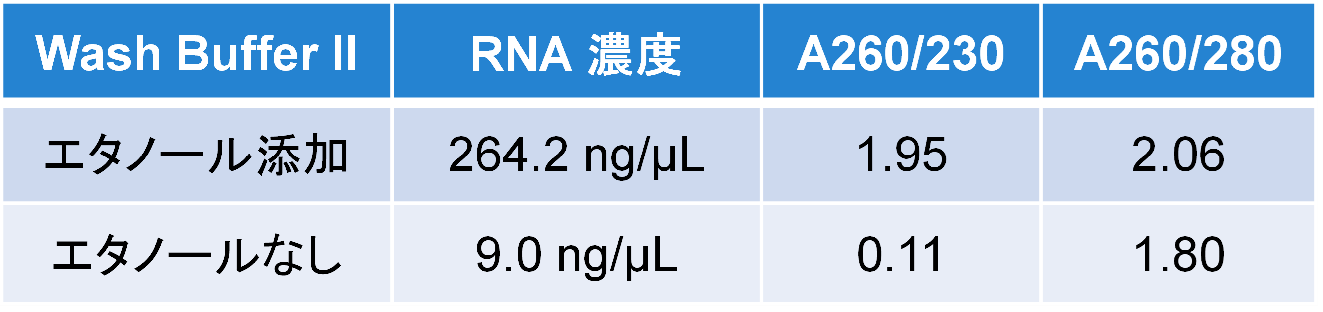 エタノールを添加なしのWash Buffer IIを使用すると、RNAをほとんど回収できませんでした。つまり、Lysis Bufferで溶解、シリカメンブレンへのアプライ、Wash Buffer Iで1回洗浄、Wash Buffer IIで2回洗浄、RNase-Free Waterで溶出、という手順は共通だったのに、Wash Buffer IIへのエタノール添加の有無のみでRNAが回収できませんでした。