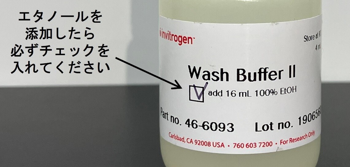 本キットがお手元に届いた後、最初に実施していただく操作はWash Buffer IIにエタノールを規定量加えていただくことです。4 mLのWash Buffer IIに対して、16 mLの96~100%エタノールを加えて混合する必要があります(終濃度80容量%)。試薬のボトルにもエタノールを添加したことを記録するチェックボックスはあるのですが、使用途中で液量が減ってくると本当にエタノールを入れたのか不安になることがあります。では、うっかりエタノールを添加し忘れたまま実験するとどうなるのでしょうか?