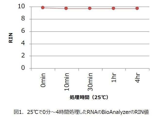 常温では4時間まで分解が見られなかったことで、安心してRNA実験ができると感じられた方も多かったのではないでしょうか。しかし、今回は弊社の精製キットで十分に純度を高く精製されたRNAを用いましたが、RNAに夾雑物が多い場合は分解が進む可能性もあります。そのため、基本を守ってRNAは氷上で取り扱うことをお勧めします。