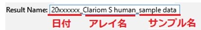ここまで入力を終えたら、画面左下の「Result Name」に解析のファイル名を入力します。Result Nameはデフォルトでは「Analysis_1」のように番号が振られていくだけですので、何をいつ解析したかがわかりません。デフォルトのままではなく、「いつ」「どのアレイで」「何を」解析したのかわかるように、「日付」「アレイ名」「サンプル名」などを入れるようにしましょう。
