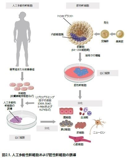 前述のように、ヒト多能性幹細胞(PSC)は、自己を際限なく再生し、適切な微小環境においてヒト体内に存在するほぼすべての細胞タイプに分化する能力を特徴とします。PSCは、胚性幹細胞(ESC)と人工多能性幹細胞(iPSC)の2種類が一般的に研究されています(図2.1)。ヒトESCは、発生中の胚の胚盤胞期の内部細胞塊から単離されます *1 。iPSCは、ESCと同等または類似する細胞ですが、成体体細胞をリプログラミングするためのOCT3/4、KLF4、SOX2、およびc-MYCなどのリプログラミング因子の発現を経て生成します *2,3 。iPSCは、患者の幹細胞の誘導を簡素化することにより幹細胞研究に革命をもたらしました。これにより、iPSCを使用して、シャーレ中で疾患特異的な細胞タイプのモデルを作製することが可能となりました。これらのモデルは、疾患病態のメカニズムを定義するのに有用で、治療ターゲットの同定や創薬において重要な役割を果たすことができます。機能的な成熟細胞に分化するよう方向付けることが可能なiPSCを無制限に供給できることは、糖尿病、肝疾患、およびパーキンソン病やアルツハイマー病などのさまざまな疾患に対する細胞療法のための原材料として非常に有望視されています。さらに、ヒトiPSC と CRISPR-Cas9 ゲノム編集ツールを併用することにより、疾患遺伝子の同定、ヒト疾患のモデル化、in vitro での再生療法に関する研究戦略実現のための効果的なツールを研究者に提供します。