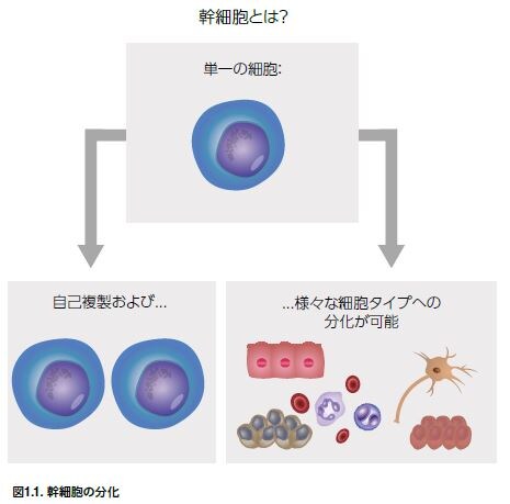幹細胞とは、自己複製能と分化能を持つ特殊化していない細胞と定義されています(図1.1)。自己複製とは、幹細胞が複数の細胞分裂の周期を経ても、未分化状態を維持する(すなわち、母細胞と同一の娘細胞を生成する)能力と定義されています。これに対し分化能とは、幹細胞が体内に存在するニューロン、肝細胞、あるいは筋細胞などの特殊化した細胞タイプに分化する能力を指します。