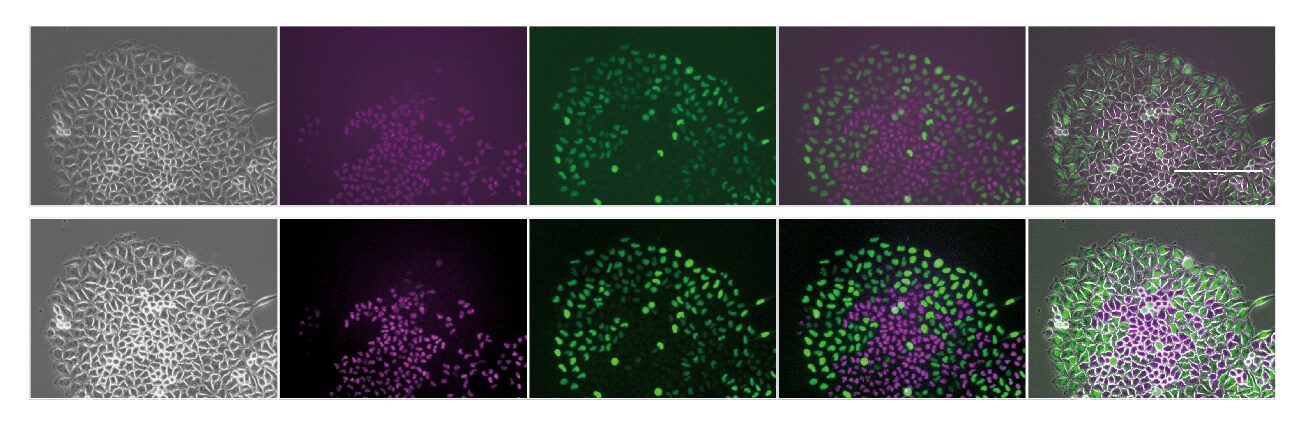 HeLa細胞にFucci2プローブ(mCherry、mVenusを使用)を導入し、20倍の対物レンズで撮影。上段は8ビットで保存。下段は16ビットで保存後、解析ソフトウェアで調整。左から、明視野、mCherry(TexasRed用ライトキューブ使用)、 mVenus(YFP用ライトキューブ使用)、mCherryとmVenusの重ね合わせ、さらに明視野を重ねた画像。最適なライトキューブを使うことで、多色蛍光でも漏れ込みなく、かつ明るく撮影できることを確認できました。(写真提供 : 阪上(沢野)朝子氏)