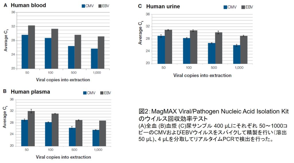 全血、血漿、尿サンプル(400μL)にそれぞれ 50~1000コピーのcytomegalovirus (CMV) および Epstein-Barr virus (EBV) スパイクした精製試験では、精製後のサンプル(溶出量50μL)から4μLを分取してリアルタイムPCRで検出を行い感度のテストを行ったところ、わずか50コピーのスパイクサンプルでも十分に検出できる感度が確認できました(図2)。