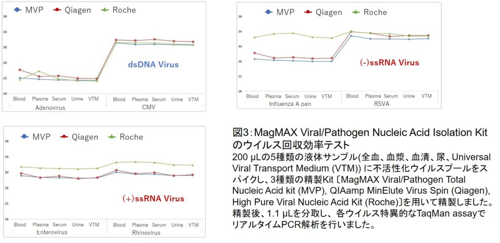 またdsDNAだけでなく (+)ssRNA, (-)ssRNAウイルスも同様に高感度な検出が可能で、他社のウイルス精製システムとの比較テストでは同等以上の感度でウイルスを検出することができました(図3)。