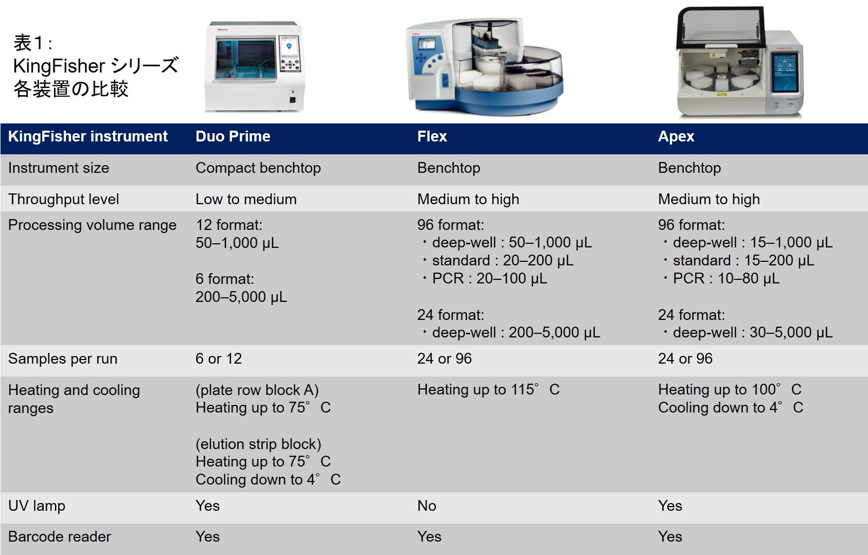 自動精製をサポートするKingFisher™シリーズでは、磁性ビーズをベースとした精製システム(MagMAX™シリーズ)に最適化されたプロトコールが作成されており、高効率で再現性の高い核酸精製を可能にします。MagMAX™シリーズではスタートサンプルや標的核酸のタイプに合わせてさまざまなKitが開発されています。すべてのKitは磁性ビーズの表面に核酸を結合/洗浄/溶出の工程で経て回収を行います。KingFisher™シリーズは、磁性ビーズをマグネットヘッドに結合させた状態で、結合/洗浄/溶出bufferの分注されたwell(またはPlate)を移動することで、核酸精製を行います(図1)。また精製工程では完全に最適化された強度のミックス処理や加熱処理を組み合わさることで最高のパフィーマンスがデザインされています。KingFisherシリーズはニーズに合ったスループット性の機器を選択することができます(表1)