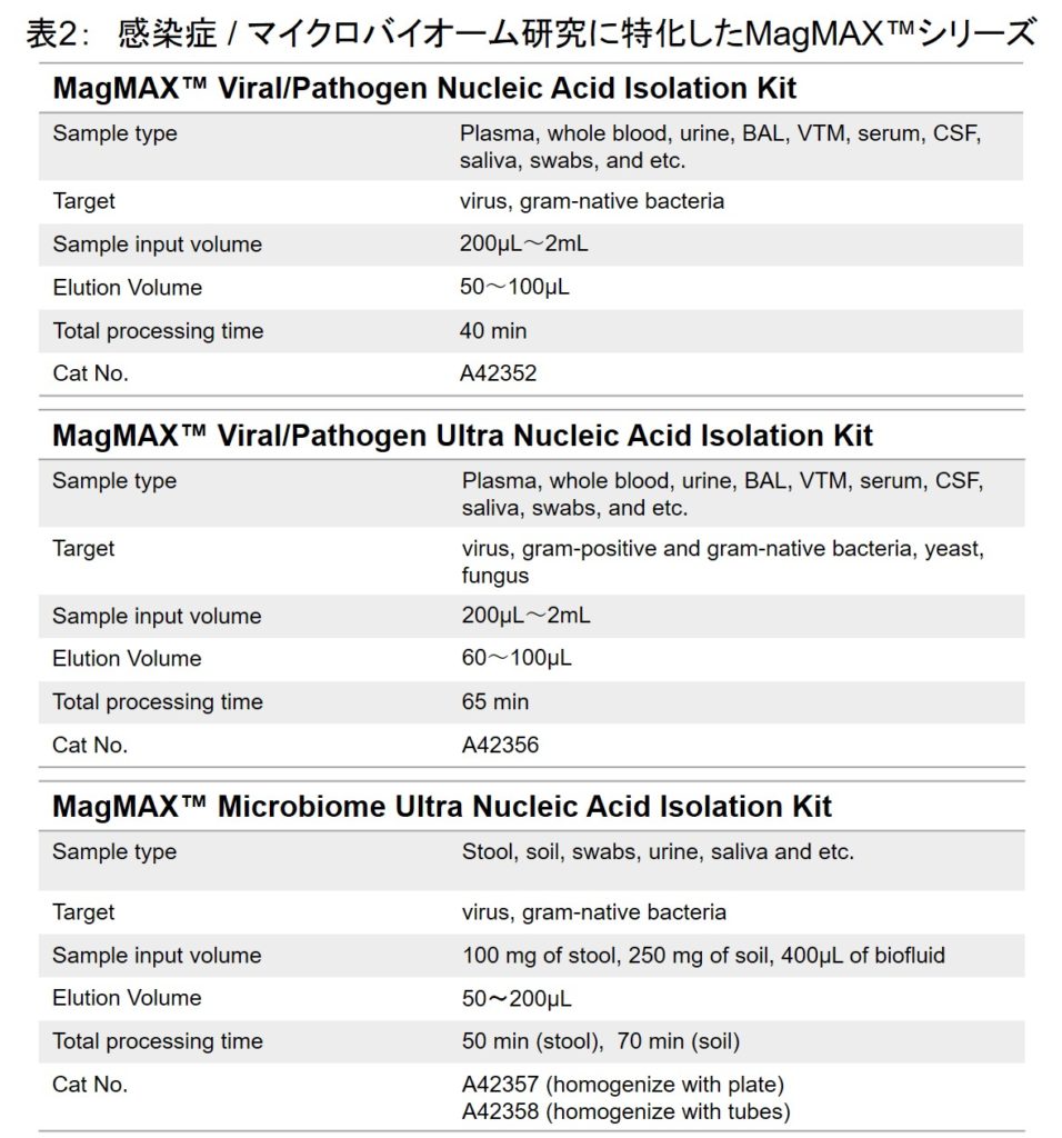 MagMAX™シリーズの製品ラインアップに感染症 / マイクロバイオーム研究に特化した製品(表2)が新たに追加されました。