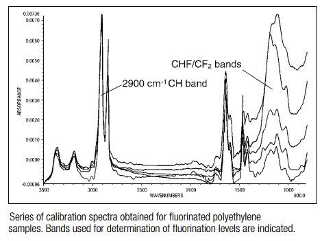 Chemically reinforced polyethylene is used in many industrial applications. Fluorination of the polyethylene surface is one of the processes for improving its performance. The fluorination level can be conveniently monitored using an FT-IR spectrometer, offering price and performance advantages over neutron activation analysis (NAA) and electron scatter analysis (ESCA).