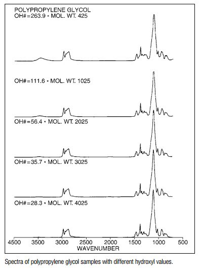 Knowledge of the hydroxyl group content of glycols is important for predicting the functional characteristics of the products. The hydroxyl value relates to molecular weight, viscosity, extent of reaction, and other parameters important to and dependent on the final application. Assessment of this value can be quickly and easily done using FT-IR.