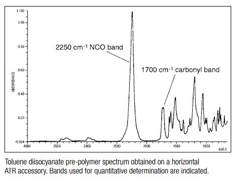 Toluene diisocyanate (TDI) is used in various resin blends in the manufacture of polymeric foams. The TDI concentration in the pre-polymer mixture affects the quality of the final product. Attenuated total reflectance (ATR) FT-IR spectroscopy can be used to quantitatively determine the TDI concentration in resin blends prior to polymerization to ensure product quality. Once the calibrated method is developed, analysis can be performed with a single keystroke.