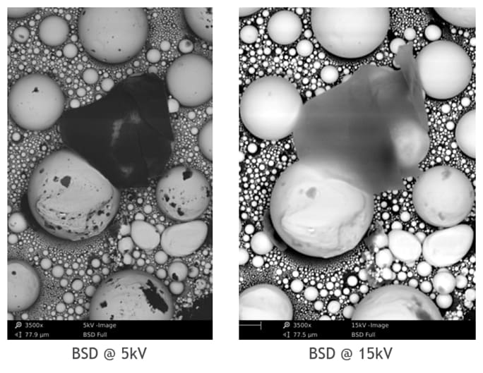 BSE images of a tin ball sample with carbon dirt flakes taken with 5kV and 15kV beam acceleration voltages. Since the dirt flakes are very shallow, they become less visible when a 15kV acceleration voltage is used.