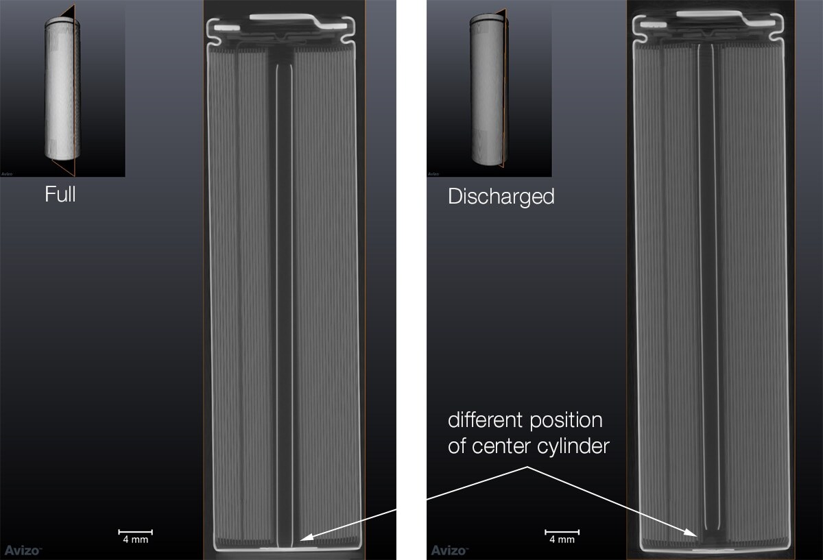 By comparing the interior of a full and discharged lithium-ion battery using microCT, researchers saw that the center cylinder shifted slightly, causing the battery to fail over time.
