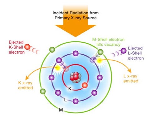 XRF occurs when a fluorescent (or secondary) x-ray is emitted from a sample that is being excited by a primary x-ray source. See image below: