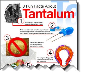 INFOGRAPHIC: 8 Tantalum Facts Tantalum ThumbnailTantalum is used in electronic equipment such as mobile phones, video game systems, and computers, as well as surgical equipment and artificial joints. Our last article addressed the high demand for products made from tantalum or tin, which was driving innovators in the mining industry to find ways to quickly test and identify samples. Now, I invite you to download this Infographic and see 8 Fun Facts about Tantalum.