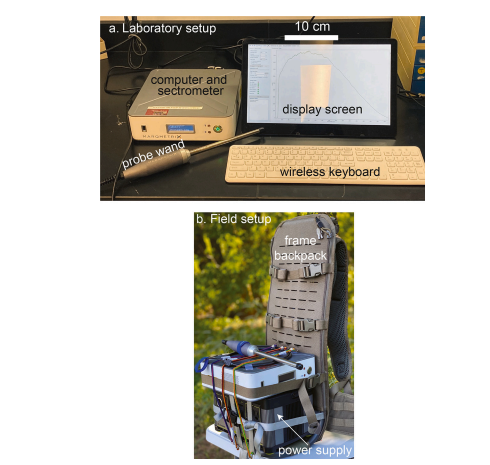 Photo above: “Data were collected using a MarqMetrix All-In-One portable Raman probe which is equipped with a handheld wand connected by fiber optic cable to a combined computer-spectrometer that measures 25 × 25 × 7.5 cm. A computer screen is required to control the instrument and view data. The total weight of the instrument is ~9 kg, and it can be easily transported via external frame backpack or hard case,” the authors wrote.1