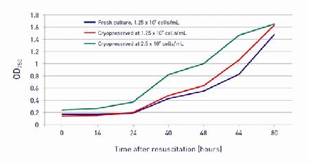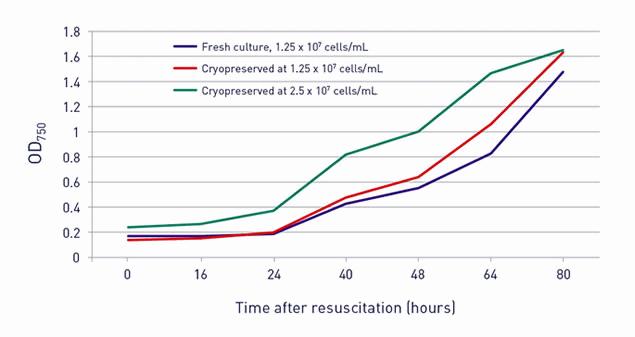 Three Chlamydomonas reinhardtii cultures were grown at 50 µE m-2s-1, 26°C, and 110 rpm, and optical densities were measured at OD750 at 16, 24, 40, 48, 64, and 80 hrs. The culture represented by the blue line started with a fresh culture, and the cultures represented by the red and green lines were frozen at different cell concentrations using the GeneArt® Cryopreservation Kit for Algae and resuscitated in TAP growth media, following manufacturer recommendations. Similar results were seen with Chlorella vulgaris, either wild type or transformants.