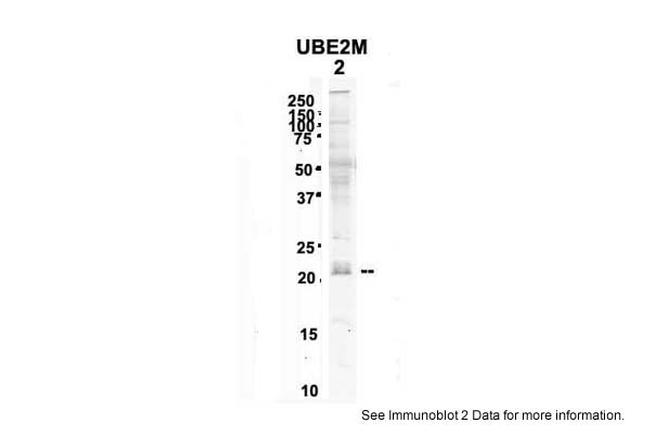 Western blot analysis of mouse brain cells using an anti-UBE2M polyclonal antibody (Product # PA5-42283). Primary Antibody Dilution: 2 µg/ml; Secondary Antibody: IRDye 800; Secondary Antibody Dilution: 1:20,000.; LANE 2) mouse brain extracts (80µg).