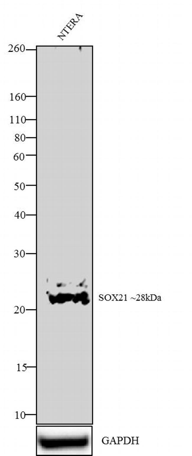 Western blot analysis was performed on whole cell extracts (30 ug lysate) of NTERA-2 (Lane 1). The blots were probed with SOX21 Rabbit Polyclonal antibody (Product # 720156, 2-3 µg/ml) and detected by chemiluminescence using Goat anti-Rabbit IgG (H+L) Superclonal™ Secondary Antibody, HRP conjugate (Product # A27036, 0.4 ug/ml, 1:2500 dilution). A 28 kDa band corresponding to Sox21 was observed. Known quantity of protein samples were electrophoresed using Novex® NuPAGE® 10% Bis-Tris gel (Product # NP0301BOX), XCell SureLock™ Electrophoresis System (Product # EI0002) and Novex® Sharp Pre-Stained Protein Standard (Product # LC5800). Resolved proteins were then transferred onto a nitrocellulose membrane with PierceTM Power Blotter System (Product # 22834). The membrane was probed with the relevant primary and secondary Antibody following blocking with 5% skimmed milk. Chemiluminescent detection was performed using Novex® ECL Chemiluminescent Substrate Reagent Kit (Product # WP20005).