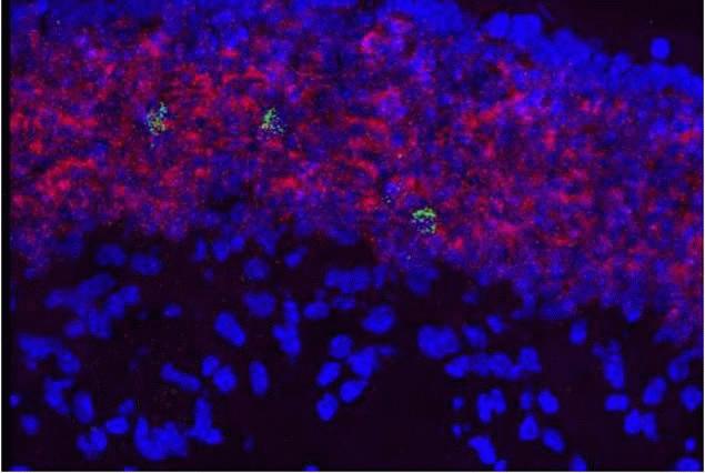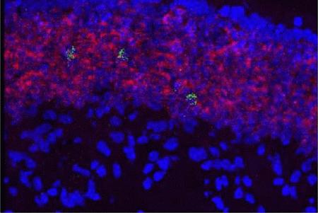 Mouse fresh-frozen olfactory bulb was stained with gene specific target probes to detect olfactory marker protein (OMP, green) and olfactory receptor (Oflr73, red) mRNA expression, and counterstained with DAPI (blue). The image was obtained using a 40X objective on Zeiss Axio imager and taken/composited with a Nuance FX multispectral imaging system.
