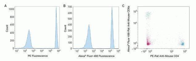 (A) The AbC™ Total capture beads bound to phycoerythrin (PE)-conjugated rat anti-mouse CD4 antibodies (Cat. no. MCD0404) generated positive signal in the BL2 channel (575/26) and unconjugated beads provided the negative signal. (B) The Total AbC™ capture beads bound to Alexa Fluor® 488-conjugated rat anti-mouse CD8a (Cat. no. MCD0820) generated positive signal in the BL1 channel (530/30) and unconjugated beads provided the negative signal. (C) A dual-parameter dot plot anti-mouse CD8a using compensation settings obtained with the AbC™ Total Antibody Compensation Bead Kit.