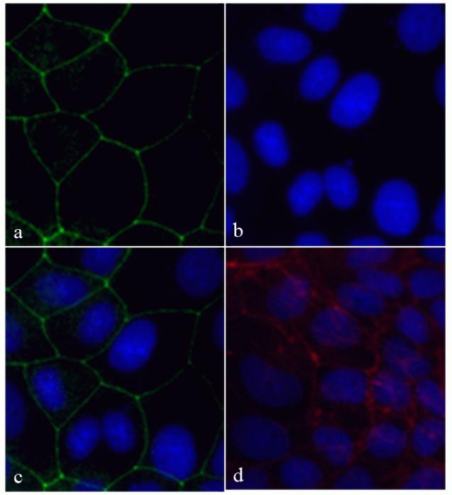 Immunocytochemistry analysis of Caco-2 stained with ABfinity™ Recombinant ZO-1 Rabbit Oligoclonal Antibody (2µg/mL) using a: Alexa Fluor® 488 goat anti-rabbit as a secondary antibody (green). b: DAPI stained Caco-2 cell nuclei (blue). c: Composite image of cells showing antibody staining membrane and tight junction. d: no primary control.