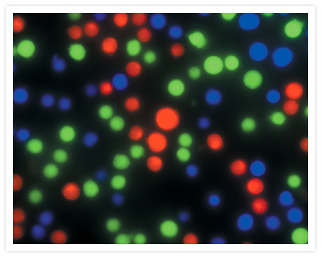 Jurkat cells were incubated with either green-fluorescent calcein AM (C1430, C3099, C3100MP), CellTrace™ calcein red-orange AM (C34851) or calcein blue AM (C1429). The labeled cells were then combined and imaged with the appropriate filters.