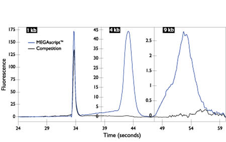 1 kb, 4 kb, or 9 kb templates were used in the MEGAscript™ Kit or in another manufacturer's in-vitro transcription kit according to protocol. 20 µL reactions were diluted to 100 µL and 1 µL was assessed on the Agilent 2100 bioanalyzer. The single primary peak is indicative of product quality while the area under the peak is related to yield.