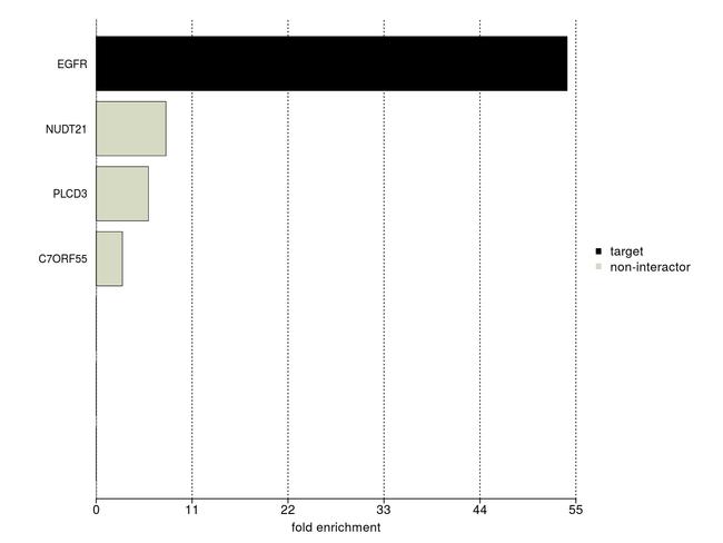 IP-MS enrichment of EGFR (LFQ intensity): EGFR was enriched 54-fold from A549 lysate compared to background proteins, using the optimized IP-MS workflow with Pierce MS-Compatible Magnetic IP Kit protein A/G (Part No. 90409) and EGFR antibody (Part No. MA5-13319). The STRING database (www.string-db.org) was used to identify the protein interactor list. See more information on IP-MS verification of antibody selectivity.