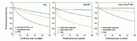 Photobleaching resistance was quantified on an LSM 710 (Zeiss) confocal microscope. HeLa or U2OS cells were stained and mounted using standard ICC protocols. Five regions within three fields of view were scanned 50x with a 1.58 µs dwell time per pixel. Excitation wavelength and intensity were optimized for the fluorophore being measured.