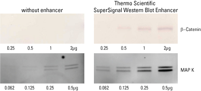 HeLa cell lysate was separated by electrophoresis, transferred to nitrocellulose (Top) or Low-Fluorescence PVDF (Part No. 22860) (Bottom) and Western blotting was performed using the conventional method (Left) or using the SuperSignal Western Blot Enhancer protocol (Right). For chromogenic detection (Top), the nitrocellulose membranes were blocked with SuperBlock in TBS (Part No. 37535) and probed with rabbit anti-ß-Catenin (LabVision Part No. PAb RB-1491-PABX) at 0.2µg/mL followed by alkaline phosphatase-conjugated goat anti-rabbit IgG (Part No. 31340) at 0.04µg/mL. Detection was performed with Thermo Scientific 1-Step NBT/BCIP Substrate (Part No. 34042). For fluorescent detection (Bottom) , the PVDF membranes were blocked with Blocker BLOTTO in TBS (Part No. 37530) and probed with rabbit anti-MAP Kinase at 1µg/mL followed by Thermo Scientific DyLight 488-conjugated and goat anti-rabbit IgG (Part No. 35552) at 0.1µg/mL. Membranes were imaged with the GE Healthcare Typhoon™ 9410 Instrument.