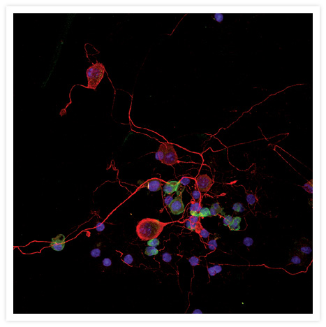 Fluorescence immunostaining of a fixed co-culture of murine neurons and dendritic cells. Neurons were labeled with an antibody directed against neurofilament triplet H (NFH) protein and visualized using red-fluorescent tetramethylrhodamine goat anti–mouse IgG (CAt. no. T2762). Dendritic cells were labeled with a biotin conjugate of a primary antibody directed against the integrin CD11c and visualized using green-fluorescent Alexa Fluor® 488 streptavidin (Cat. no. S11223, S32354). Nuclei were stained with blue-fluorescent TO-PRO®-3 (Cat. no. T3605). Image submitted by Gauthier Dorban, Institute of Human Histology, University of Liège, Belgium.