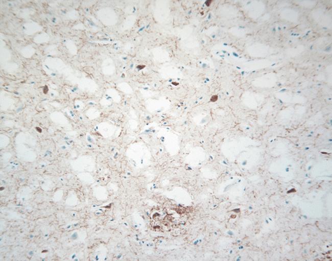 Immunohistochemical staining of Alzheimer's disease brain tissue using p38 MAPK [pT180/pY182] Polyclonal Antibody, Rabbit