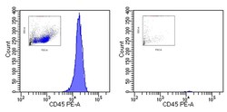 Dynabeads CD45 Beads are uniform, superparamagnetic beads (4.5-μm diameter) coated with a primary monoclonal mouse IgG2a antibody specific for all known isoforms of CD45, a membrane glycoprotein found on all human leukocytes. Dynabeads CD45 Beads can be used to easily and efficiently isolate or deplete CD45-positive cells from viscous samples such as whole blood and bone marrow in about 30 minutes. Isolated cells can then be used for downstream molecular or proteomic studies.