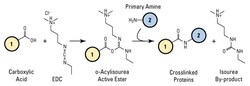 El 1-etil-3-(3-dimetilaminopropil)carbodiimida hidrocloruro (EDC o EDAC) es un agente de entrecruzamiento de longitud cero utilizado para asociar los grupos carboxilo con aminas primarias. Este entrecruzador se ha utilizado en diversas aplicaciones, como la formación de enlaces amida en la síntesis de péptidos, la colocación de haptenos en proteínas de transporte para formar inmunógenos, el etiquetado de ácidos nucleicos a través de grupos de 5' fosfato y la creación de ésteres NHS reactivos a aminas de biomoléculas. El EDC reacciona con un carboxilo para formar un intermedio de