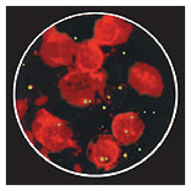When the antibody conjugate is added to a cover slip containing ethanol-fixed tissue culture cells, the reagent binds specifically to any chlamydial inclusions present in the cells. A washing step removes unbound antibody conjugate. When the stained coverslip is viewed under a fluorescence microscope, large bright apple-green inclusions within infected cells are observed against a red counterstained background of cells.