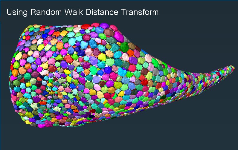 Compared to traditional distance maps, the Random-Walk Distance Map is less sensitive to noise in the segmentation, or to the shape factor of the objects, and provides more robust results for object separation.
