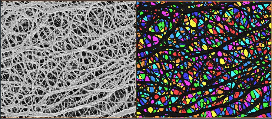 The recipe classifies the pores in a battery separator. It relies on a hysteresis thresholding that allows to propagate the threshold to pixels above the lower threshold if they are connected to pixels selected by the highest threshold. This procedure allows to threshold full porosities while avoiding noise.