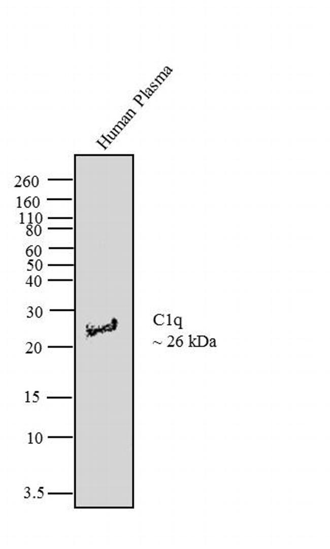 Western blot analysis was performed on 5uL of Human Plasma (Lane 1). The blot was probed with Anti-C1q Mouse Monoclonal Antibody (Product # MA5-17215, 4 ug/ml) and detected by chemiluminescence using Goat anti-Mouse IgG (H+L) Superclonal™ Secondary Antibody, HRP conjugate (Product # A28177, 0.4 ug/ml, 1:2500 dilution). A 26 kDa band corresponding to C1q was observed in the plasma sample tested. Known quantity of protein samples were electrophoresed using Novex® NuPAGE® 4-12 % Bis-Tris gel (Product # NP0321BOX), XCell SureLock™ Electrophoresis System (Product # EI0002) and Novex® Sharp Pre-Stained Protein Standard (Product # LC5800). Resolved proteins were then transferred onto a nitrocellulose membrane with iBlot® 2 Dry Blotting System (Product # IB21001). The membrane was probed with the relevant primary and secondary Antibody following blocking with 5 % skimmed milk. Chemiluminescent detection was performed using Novex® ECL Chemiluminescent Substrate Reagent Kit (Product # WP20005).