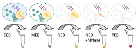 Proteins are sequentially extracted using differential detergents. CEB = cytoplasmic extraction buffer; MEB = membrane extraction buffer; NEB = nuclear extraction buffer; NEB + MNase = nuclear extraction buffer plus micrococcal nuclease (chromatin-bound fraction); PEB = pellet extraction buffer.