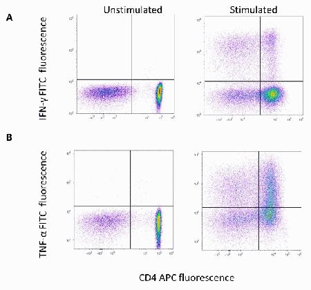 Red blood cell lysed peripheral blood mononuclear cells were left unstimulated (left column) or stimulated (right column) for 5 hours with phorbol myristate acetate (PMA) and ionomycin in the presence of brefeldin A. Cells were then fixed and permeabilized using the FIX & PERM® Cell Permeabilization Kit (Cat. no. GAS003 or GAS004) and stained intracellularly with anti-human CD4 APC (Cat. no. MHCD0405) and either anti-human interferon gamma (IFN-gamma) FITC (Cat. no. MHCIFG01) (A) or anti-human tumor necrosis factor alpha (TNF-a) FITC (Cat. no. A18469) (B). Samples were collected using the Attune® Acoustic Focusing Cytometer (blue/red) with 488 nm excitation and 530/30 nm bandpass emission filter to detect FITC. 633 nm excitation and 660/20 nm bandpass emission filter were used to detect APC.