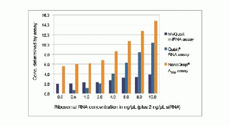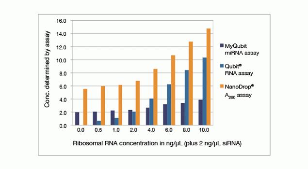 rRNA at the concentrations shown was spiked into solutions containing 2 ng/µL siRNA, then read using the Qubit®/Quant-iT™ miRNA assay, the Qubit®/Quant-iT™ RNA assay, or by 260 nm absorbance (A260) on the NanoDrop® spectrophotometer.